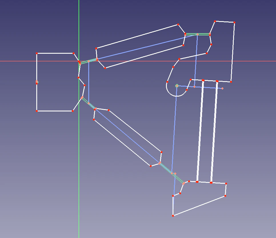 I tried several different rigid body solvers, but found them clumsy to use. You would have to define your model using code, or import it from some CAD package. I wanted something I could work on in realtime. I started using FreeCAD to sketch out ideas, using the constraint solver in the Sketcher workbench as a poor man’s rigid body solver. I found that FreeCAD worked fine for my use case (I wasn’t worried about kinematics or dynamics at this point, I was looking for a mapping between crank angles and end effector position). FreeCAD has a python interface, so I wrote a script that would periodically change the angle of the input link.